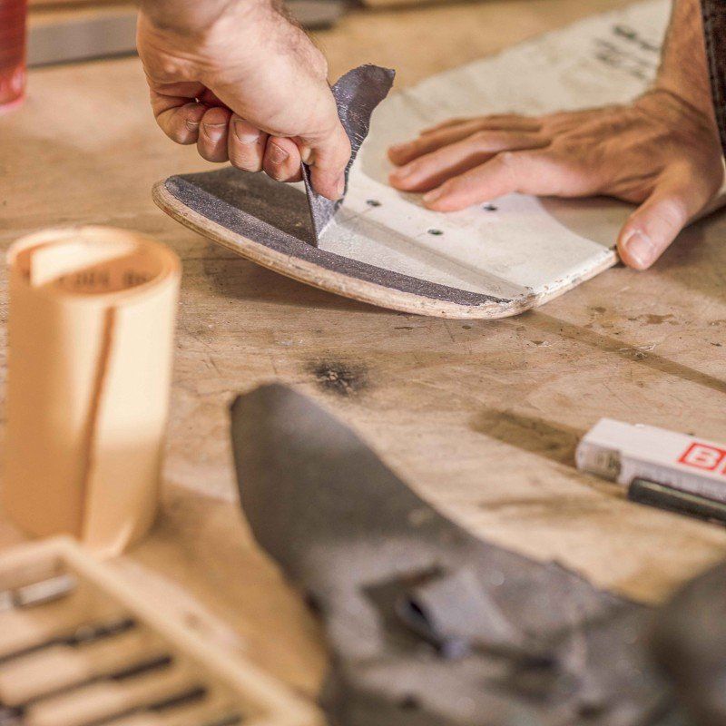 Para que los tableros de arce sean flexibles tal y como es necesario en un monopatín, y que puedan ser capaces de doblarse sin romperse, déjalos a remojo durante varias horas o introdúcelos en una campana de vapor profesional durante 45 minutos. Cuando estén secos coloca una capa sobre otra y únelas con pegamento, superponiéndolas con total precisión.